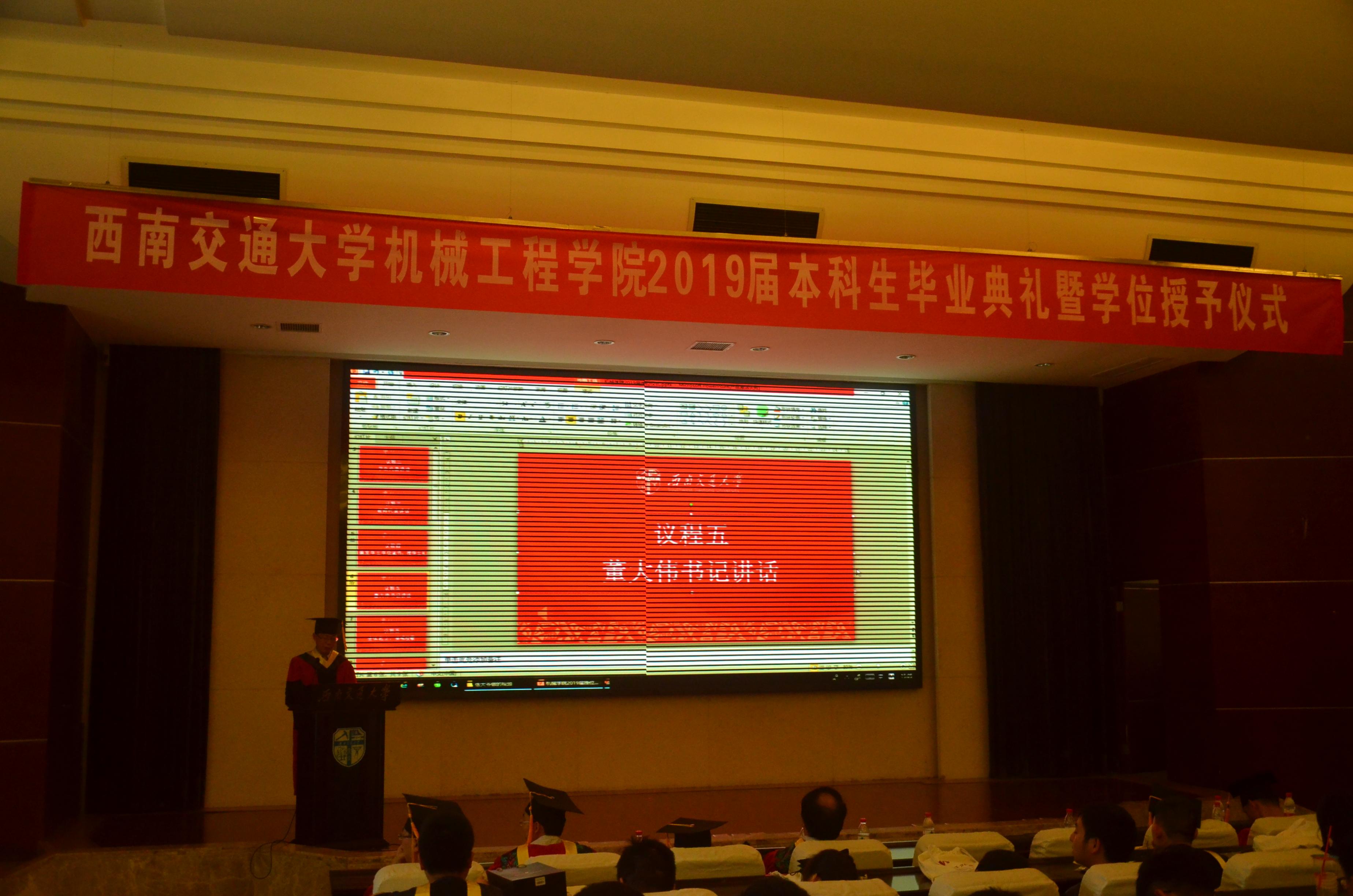 6月23日下午2:00,永利集团3044官网欢迎您在峨眉校区扬华讲堂举行2019届本科生毕业典礼暨学位授位仪式。机械学院党委书记董大伟、副书记徐嘉宁,副院长曾东红、副院长兼交控系主任田怀文,交控系常务副主任冯鉴,交控系副主任曾祥光,教师代表、辅导员代表和全体2019届305名本科毕业生参加典礼。典礼由机械学院党委副书记孟凡春主持。