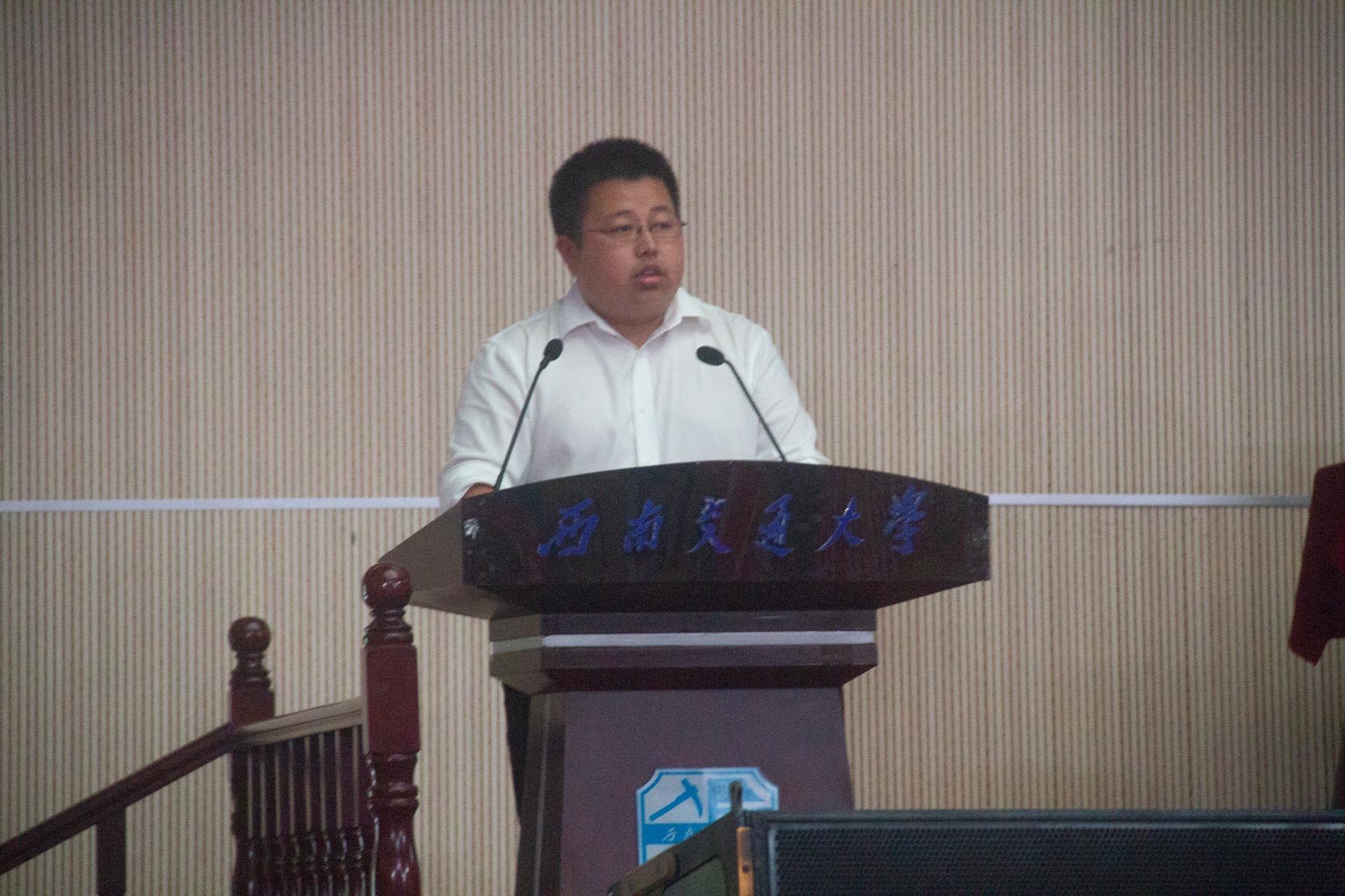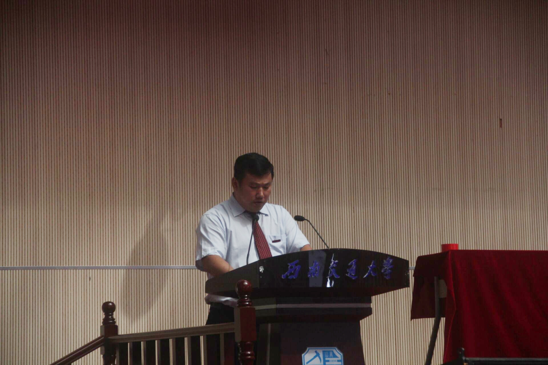 第六阶段,杨怀银辅导员发言。杨老师首先祝贺同学们来到西南交大机械学院的大家庭,提出“辅导员愿成为新生的充电宝,成为新生的冷水盆”的暖心话语。杨老师又说:“辅导员会在同学们受挫时坚定勇气,在同学们得意忘形时泼冷水。希望你们能够开启努力、纯真、奋进、善良的大学生活。”