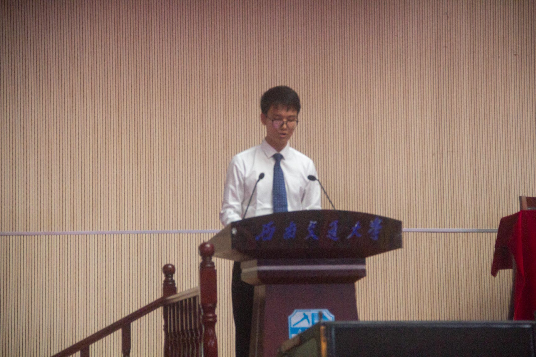 第五阶段,新生代表赵亦君同学发言。赵亦君同学道:努力是大学生活的主旋律,我们应该精勤求学。当今高速铁路、磁浮交通、摩擦学、新能源等方面需要机械人发挥自己的热度,投身其中。而后,赵同学对新生说道:应该注重实践,并且与周围的人打好关系,要有“运筹帷幄,决胜千里”的气魄,愿你们有一个无悔的大学生活。