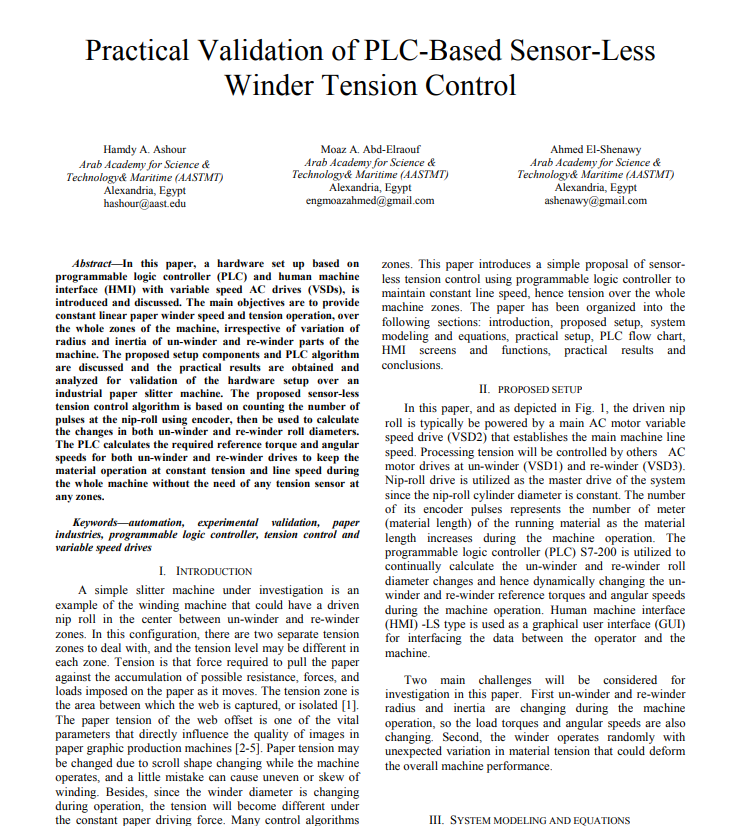 放卷端和收卷端都是独立控制的伺服电机,设定放卷为恒速度控制,收卷为恒张力控制,控制PLC输出控制量,使得放卷线速度恒定,收卷跟随放卷速度,并在此基础上根据系统当前张力状况,调节收卷线速度,使得系统维持张力恒定。