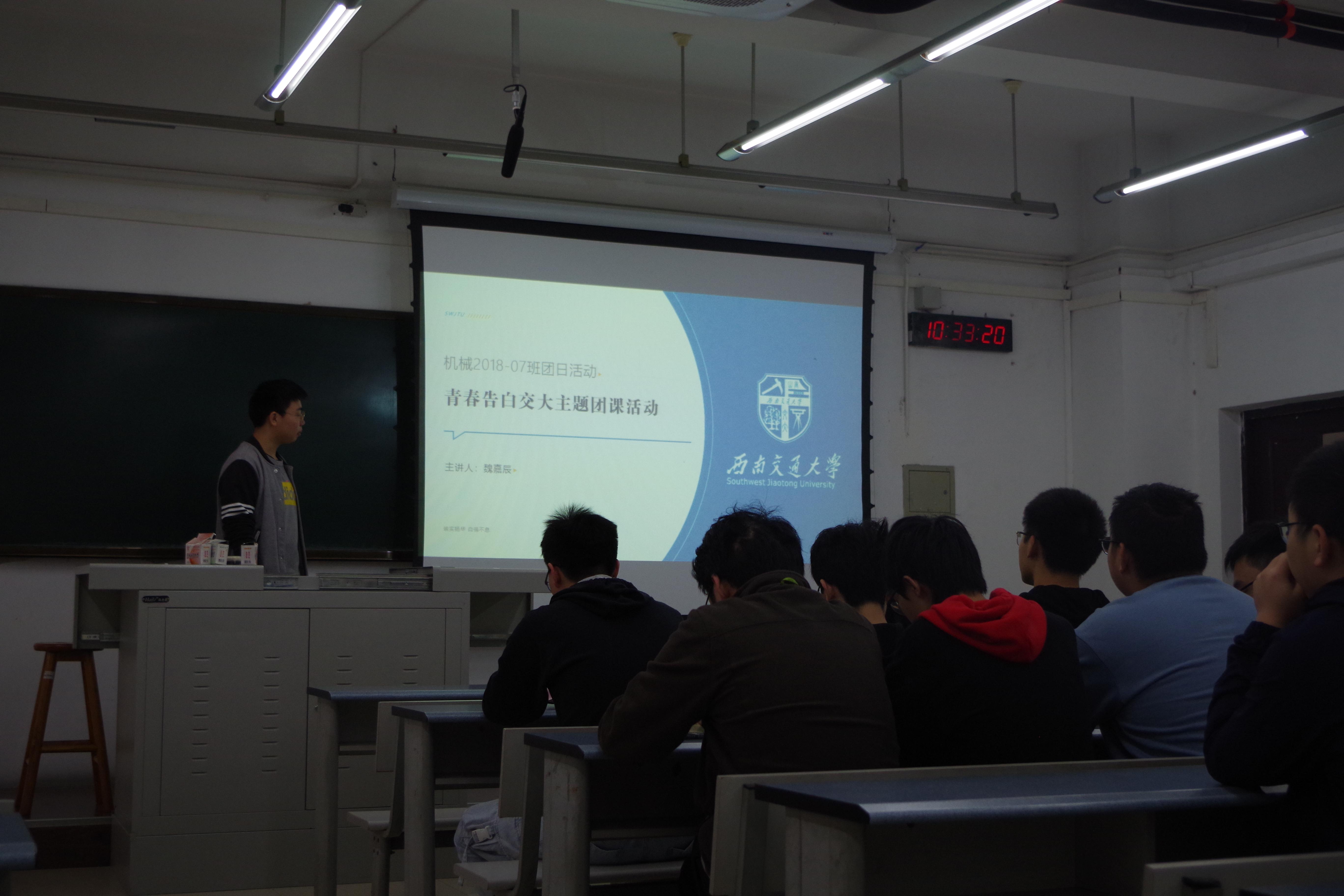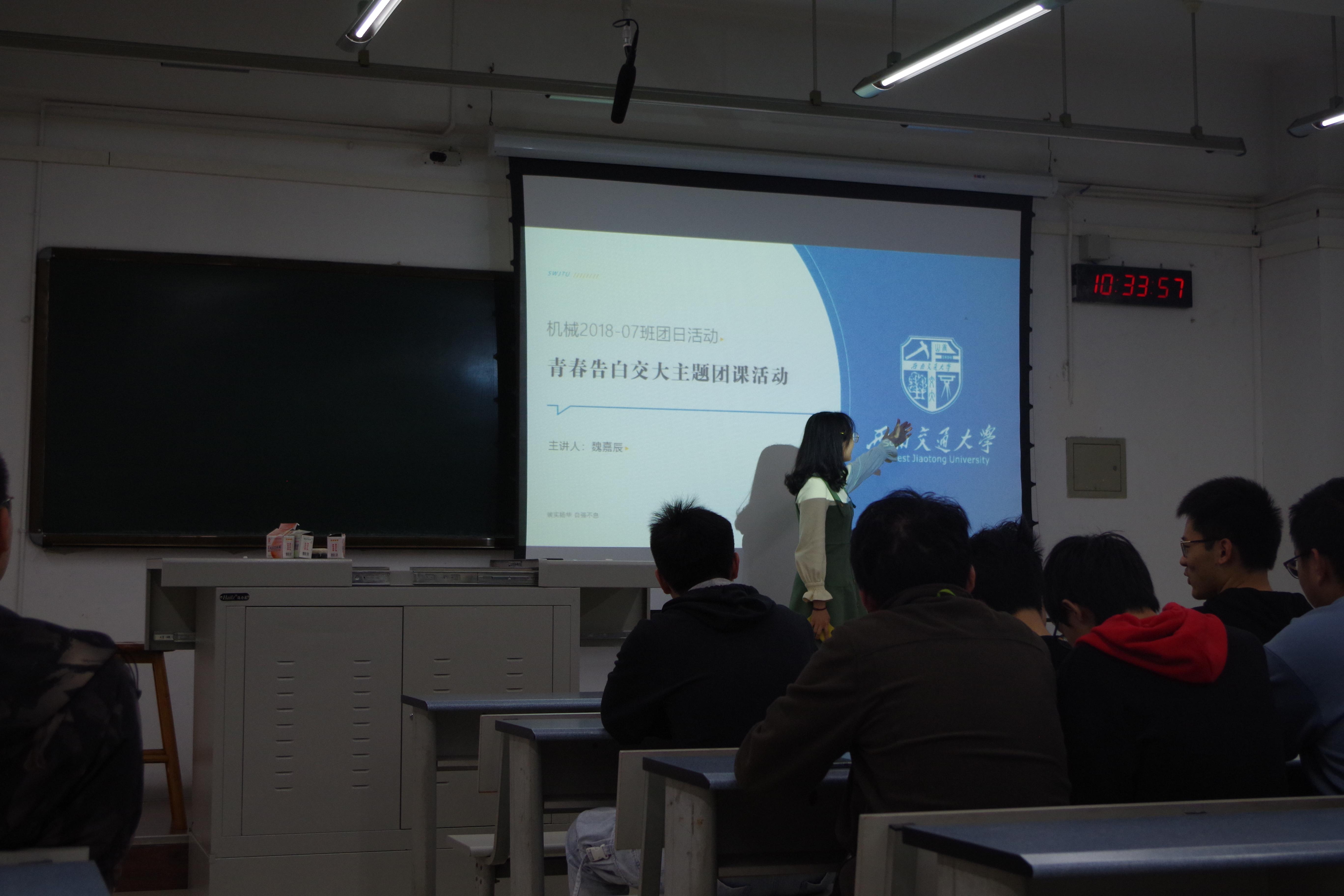 2020年10月24日,在团支书魏嘉辰的主持下,机械2018-07班的同学于X1318教室进行了“青春告白交大”的主题团课活动。本次活动的主要目的就是提高同学们的爱国情怀和爱校情怀,通过对交大历史的介绍和著名校友的介绍激发同学们积极向上的学习情怀。