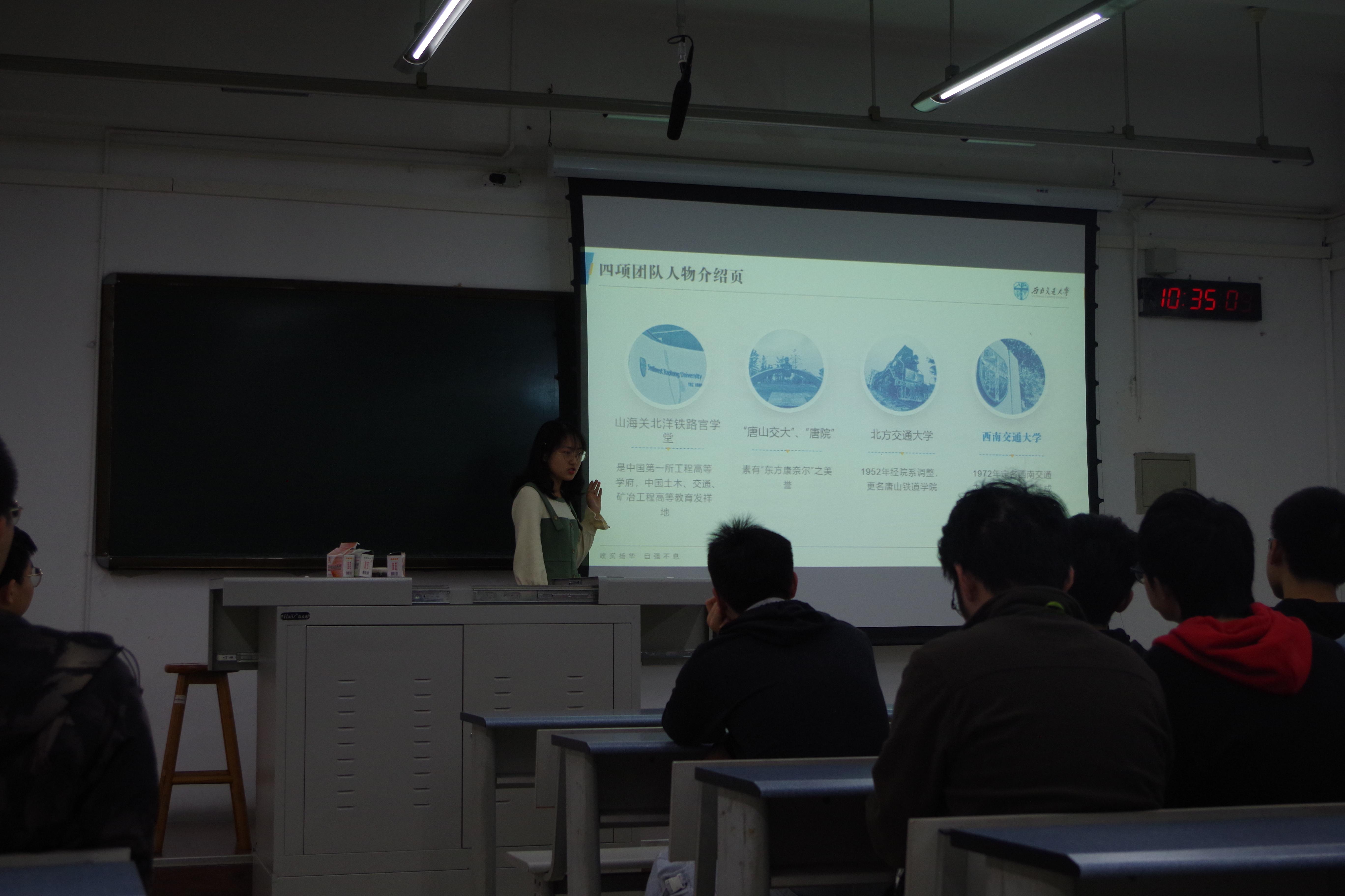第二部分,知名校友。这部分内容,团支书魏嘉辰同学为同学们介绍了交大知名的三位校友。第一位茅以升老校长,茅以升先生为铁道科学技术进步做出了卓越的贡献。积极倡导土力学学科在工程中应用的开拓者。茅以升曾主持修建了中国人自己设计并建造的第一座现代化大型桥梁——钱塘江大桥。第二位是周仲荣教授,周老师先后担任清华大学摩擦学国家重点实验室等4个国家重点实验室、西安交通大学现代设计与转子系统动力学教育部重点实验室等3个省部级重点实验室的学术委员。最后是翟婉明院士,翟院士长期从事铁路工程领域动力学与振动控制研究。在经典的车辆动力学和轨道动力学基础上,创建了机车车辆—轨道耦合动力学理论体系,建立了车辆—轨道统一模型,提出了机车车辆与线路最佳匹配设计原理及方法。
