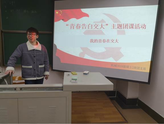 本次活动积极响应团中央庆祝新中国成立71周年,迎接建党100周年,加强对新时代学生的思想政治引领,激发交大学子爱国荣校热情,进一步推进习近平新时代中国特色社会主义思想进支部、进团课,引导支部团员青年用习近平新时代中国特色社会主义思想武装头脑。此次团课主题是:“青春告白交大”,团课由机械2班团支书、班长等班委组织,支部部分成员参加本次团课。