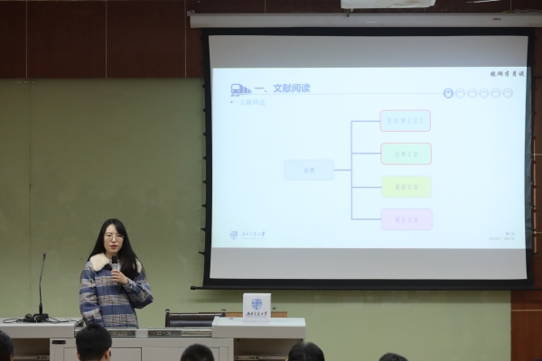 第一位主讲嘉宾是黄瑶同学,她主要从论文写作、选题技巧、资料查询和专利申请等方面分享了她的经验。她着重讲述了发表论文时期刊选择的重要性,同时也分享了她的日常规划和作息时间,对同学们以后的研究生学习有很大的指导作用。