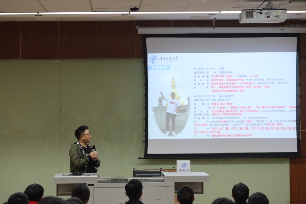 第三位主讲嘉宾是刘俊琦博士,他主要结合自身经历介绍了如何从迷茫到深造,从病痛到运动达人的经历。他告诉同学们要珍惜研究生上课学习的时光,合理规划时间,坚持论文和软件学习,最后强调身体健康才是整个研究生阶段至关重要的,他的经历让同学们认识到研究生三年要积极展现自己,相信自己大有可为。