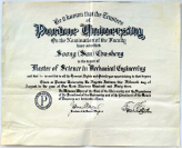 1941年10月,父亲乘船赴美国,进入通用车辆公司东芝加哥工厂工作一年,并由当时在洛杉矶加州工学院的钱学森先生代为办理了入学手续和证件,于1942年9月入印第安纳州普渡大学研究院主修机车设计专业,兼修加工工艺学和材料学专业,1943年8月获工学硕士学位。